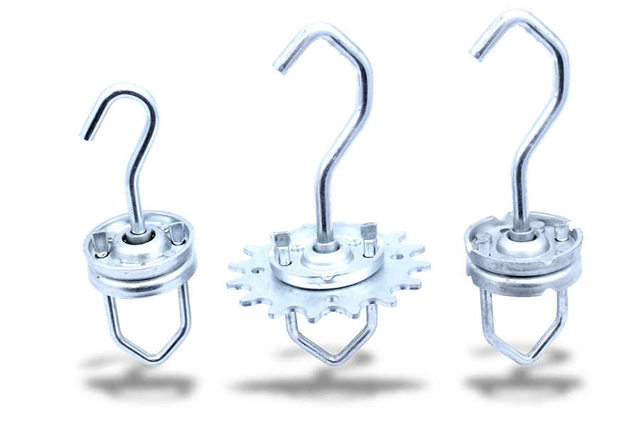 Drehhaken aus Stahl. Ideal zum Aufhängen von Objekten bei Oberflächenbehandlungen: Pulver- und Nasslackierung, Eloxieren, Galvanisieren. Erhältlich mit und ohne Krone, ermöglichen Sie dem Objekt, sich während der Behandlungsphase zu drehen.